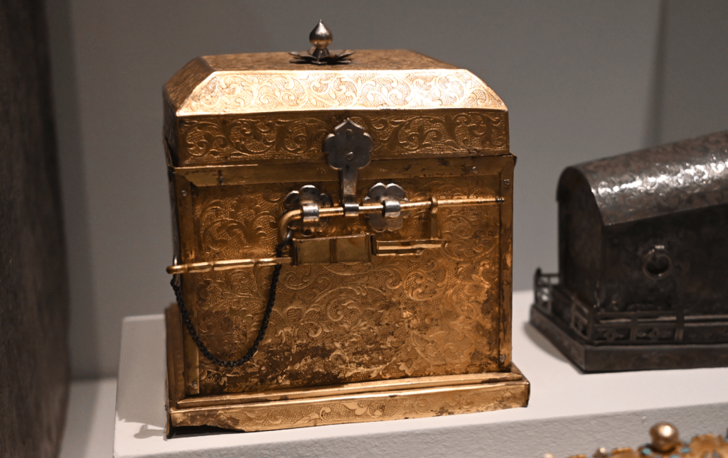 The fourth layer is a gold coffin, similar in shape to the silver one. Its lid and body are inlaid with gold sheets, pearls, and turquoise, forming a large lotus design, with additional small lotuses ornamenting its perimeter.